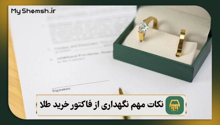 - فاکتور طلای خود را در پوشهای ضدآب قرار دهید و اگر مقدور بود، آن را در گاوصندوق یا محلی مطمئن نگهداری کنید تا از آسیب، گم شدن یا سرقت در امان بماند.